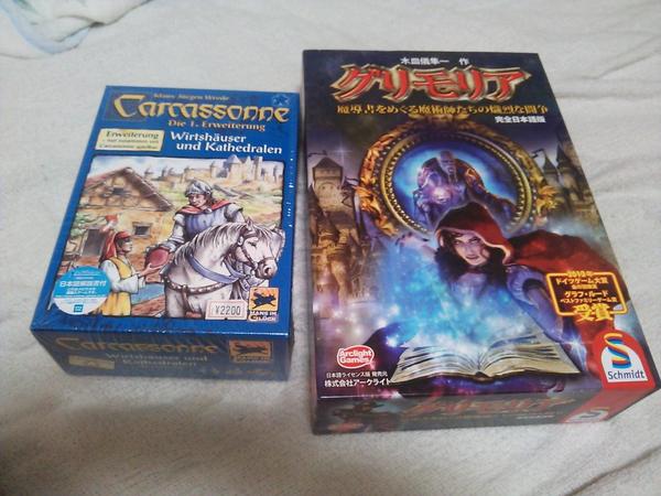 グリモリアっていう魔導書使って遊ぶやつ(面白いけど得点計算がくそめんどくさい&大人数で遊ぶ方が面白い)と、カルカソンヌの聖堂があるやつ!